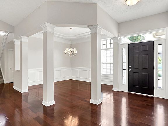 Move-in ready home in the sought-after Bridgewater community, nestled on a beautiful tree-lined lot! Step into the open and inviting floor plan, where the formal dining room flows seamlessly into a great room with soaring cathedral ceilings, a cozy fireplace, and a wall of windows that flood the space with natural light. The eat-in kitchen is ideal for everyday living, featuring abundant cabinetry, a two-tiered breakfast bar, and stainless steel appliances. Just off the kitchen, the sunroom offers a peaceful retreat for reading or relaxing. The split bedroom layout includes two spacious guest bedrooms and a private owner's suite complete with double sinks, a tiled shower, jacuzzi tub, and a walk-in closet. Upstairs, you'll find a built-in planning center with a desk and an additional guest suite with its own full bath-perfect for visitors or a home office setup. Enjoy easy access to Bridgewater's premier amenities, and take advantage of nearby neighborhood parks and scenic walking trails-all just steps from your front door.