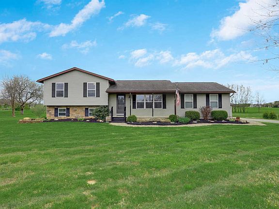 Beautiful modern home on a 1.99 acre peaceful personal paradise! 3 bedroom, 2 full bathrooms, recently updated home! This home has an attached two car garage and a detached 3 car garage! Brand new 3-dimensional roof put on in 2010. Freshly painted main floor with new updated flooring throughout! New back sliding glass door, door to garage, bathroom remodeled, laminate hardwood flooring, window in kitchen all 2018-20. Switched to gas heat in March of 2014 through Consumers Gas Cooperative.Water system rental is ~ $85 per month for the softener & RO system. The possibility to hook up to Delco is 100%. It runs along the front of property. Big Walnut Schools.Detached garage is fully finished on interior with 220 and Hot/Cold water.