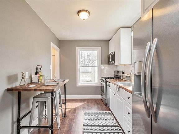 Beautifully renovated 2 bedroom 1 bath ranch includes new furnace and air conditioner, siding, windows, front porch, deck, doors, flooring, stainless steel appliances - stove, counter depth refrigerator, dishwasher and microwave, cabinets and butcher block counter tops. Custom butcher block table included. Stunning dark luxury vinyl floors on main floor and must see beautiful tile in the new bathroom. Fully fenced in back yard. Schedule a showing today!