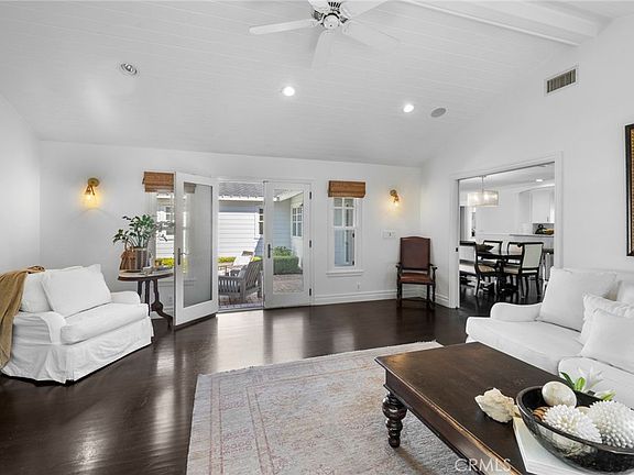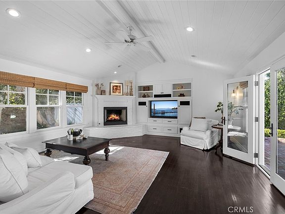 This beautifully updated California cottage blends modern style with timeless charm. Upon entering through the front Dutch door, you’re immediately greeted by stylish designer touches, like the dark cocoa-stained wood slat flooring, which balances nostalgic appeal with a contemporary feel. The home features three bedrooms, each with its own private bathroom, offering both comfort and practicality. A fourth bedroom with custom built-ins can easily be converted to a home office. The layout includes a sophisticated powder room, a cozy dining room with romantic ambiance, and a spacious great room that boasts a wood-burning fireplace and soaring vaulted ceilings with exposed beams. The kitchen is a chef’s dream, with sleek Carrera marble countertops and high-end stainless-steel appliances, seamlessly connecting to the formal dining area. The master bedroom exudes character, with its vaulted ceilings enhancing the room’s dramatic feel. A walk-in closet and expansive master bath complete this luxurious retreat. Outside, a charming brick pathway winds through lush gardens brimming with vibrant hydrangeas and delicate foliage. Follow the path to a private patio ideal for outdoor dining and discover a hidden dipping pool and hot tub. It's truly a dream home!
