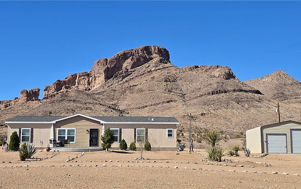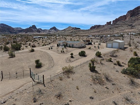 BEAUTIFUL LOCATION IN THE MUCH-DESIRED UNIT 16 WITH MOUNTAINS AND MILLION DOLLAR VIEWS! Pride of ownership shows inside and out on this 3BR, 2BA, 1,964 sq. ft. ground set Cavco MH with a detached 30X41 shop with RV pull thru doors and a nice double door shed with a concrete floor. Located on 2.35-acres and nestled at the base of the majestic Black Mountains and the Mount Nutt Wilderness area where you can enjoy hiking, biking, horseback riding, off roading, etc. Enjoy panoramic mountain and valley floor views and the Cerbat and Haulapai mountain ranges to the East from this fantastic location. This one owner desert gem has been lovingly maintained through the years, featuring a split floor plan, vaulted ceilings and views out every window, spacious living room, nice big eat in country kitchen with island, built in desk, built in microwave and lots of counter and cabinet space. The dining area is just off the kitchen and features a beautiful chandelier, if you head out the slider door you will find the 10X40 Arizona room a great place for entertaining with a wood burning stove to take the chill off in the winter mornings. The primary bedroom features a walk-in closet, the primary bathroom has double sinks, separate shower and a tub to soak your cares away after a long day. There's a room with access from the kitchen and primary bedroom that would make a great office/den or sewing room. On the opposite side of the home, you will find two nice size guest bedrooms and a full guest bathroom with skylight. Carpet throughout except for the kitchen, utility room and bathrooms. The exterior of the home features a front patio, a perfect place to sit, relax and take in the views of the valley floor and the twinkling night lights. A fenced area off the Arizona room will keep your 4-legged friends contained and safe, mature easy care desert landscaping, and a circular driveway with two sets of double gates. For family and friends visiting with an RV there are two full RV hookups, one with a 30 amp plug and one with a 50-amp plug. Easy access paved all the way until Bolsa Dr. which is maintained. Come and enjoy exploring our beautiful Arizona desert, sunrises, sunsets and starry night skies. Don't wait call a Realtor and schedule your showing today!