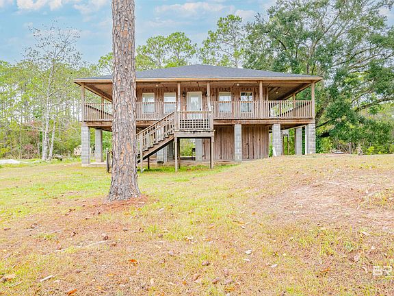 Exquisitely built country cabin on deep water canal that has easy access to Fowl River and Mobile Bay! This home was built with actual wood from the lot and has hand hewn hardwood floors from the wood as well! Super open floor plan with wrap around porch for views in all directions. Extra private area with community boat launch just one street over. You'll love this home with 2 large bedrooms and 2 full baths. Full kitchen has a view to living spaces too and overlooks the waterfront in back. Just around half an acre to enjoy the peaceful surroundings, with a large area underneath for entertaining or parking. There is also storage underneath for all your yard equipment and fishing poles. Full size laundry is in the main room of the home. This property is on septic tank, which is fully functional, but city sewer is available should the new owner prefer to hook up. The roof is new in 2021. Buyer to verify all information during due diligence.