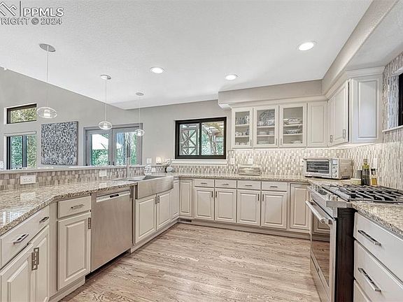 Prepare to be swept off your feet with this 5 Bed, 4 Bath, 3-Car Garage, Design-Forward Two-Story Walkout set on nearly a ½ Acre in desirable Gleneagle North. This home has been meticulously updated from top to bottom with a focus on style and quality that is unseen at this price point. Every turn rewards your eyes with tasteful details that will make your life easier and enjoyable, and hosting a gathering is a delight. The modern and relaxed European aesthetic is impressive. Natural colors and materials fill every inch of this custom home that has been recently updated with dark-framed Anderson Windows and Doors. With two kitchens, two laundry rooms, two linear fireplaces, and multiple living areas with built-ins and floating shelves, the interior is curated for those who like to live life well. The inside is only rivaled by the multiple and expansive outdoor areas that offer privacy, tranquility, and enough space to host enjoyable events. The front of the home offers a private refuge with an oversized patio with extensive landscaping. The rear of the home offers private views of the large yard that backs to a flowing stream and greenspace. Don't miss out on the chance to live in such luxury and comfort!