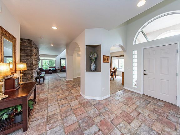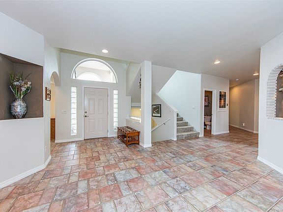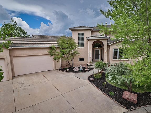 Custom stucco 1 1/2-story on private fully landscaped cul de sac lot. Formal dining & living rooms. Remodeled gourmet island kitchen with granite counters, stone backsplash, composite granite undermount sink, black stainless steel/black appliances, maple cabinets, built-in desk area, eating bar, & walk-in pantry. Large vaulted family room. Main level master suite with 5-piece bathroom. Mostly tile throughout main level. Upper level has loft, 2 identical bedrooms with 5-piece Jack & Jill bathroom between them. Beautiful finished walkout basement with 2nd family room with pool table, & custom wet bar. 2 fireplaces. 3-car finished garage. All appliances (including washer & dryer), pool table & lighting, window coverings, bar stools, & firepit included. Nearly new carpets throughout. Rounded corners. 2 furnaces, 2 hot water heaters, & 2 A/C units. Near schools, shopping, dining, & I-25. Stucco with tile roof. 3 walkouts from main level. 1 walkout from basement. 2 decks & 3 patios.