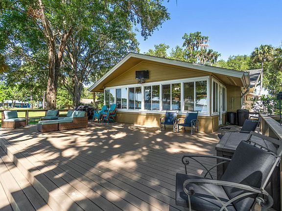 Beautiful view of Lake Weir's Sunset Harbor from lovely back deck (with new composite planks) situated in the shade of gorgeous oak tree. Three car detached garage. Composite planked dock leading to double boathouse. 100' of waterfront with white sand beach. This 3 bedroom 3 full bath home includes large master suite, large master bath, and large master closet. This has all needs and upgrades for a full time home including inside laundry with washer/dryer/extra fridge, stainless appliances, granite counter tops, plantation shutters and several living/entertaining areas inside and out. Great room overlooking back deck and lake has pretty stone wood burning fireplace. Lots of storage. 10 minutes to Fun entertainment, great food and shopping in The Villages