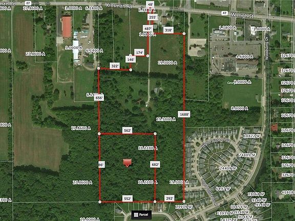 Located in a High traffic area where Kinsman Road meets W. High street. Close to Giant Eagle and Wal-mart. . Price includes two parcels (18-025900 19.3 acres & 18-025800 10.21 acres). General Commercial Zoning in high demand area. Modular home can stay or be removed. A-Frame home will be removed from the property.