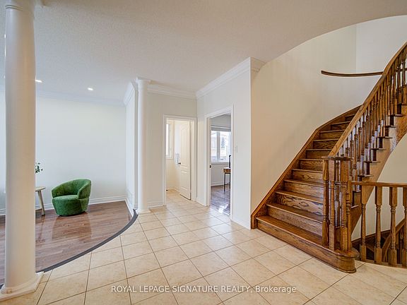 Professionally landscaped backyardCobblestone-style patioOrnamental pear treesLarge cedarsCrown mouldingsCurved oak staircasePrivate office