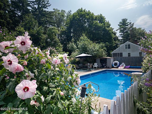 The perennial flower gardens that surround this ranch will make you the envy of the neighborhood. The seller has lived in this home since he was a child. He has loved the area and his home but knows it is time for a new adventure. Many updates throughout - Central Air, windows and sills, Corian kitchen counters and newer appliances, spray foam insulation throughout, pool liner replaced 2021 and pump 2024, handicapped accessible and generator wired. Wood burning fireplace in the living room. Sliders from the living room take you to an enclosed porch overlooking the spectacular in-ground pool you will enjoy every summer day. Beautiful lot with close proximity to I-90 and Greenbush..just a few miles to Kinderhook area. Maple Hill Schools.