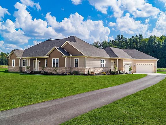 Beautiful custom built ranch with 3,247 sq. ft. located on 5.77 acres. Open floor plan with 3 bedrooms and 3.5 baths. Huge great room with cathedral ceiling and stone fireplace. Kitchen includes custom 42 inch cabinets, granite countertops with bar seating and stainless steel appliances. Master suite that features tray ceiling, dual vanity, soaking tub, large shower and walk-in closet with built-in shelving. All bedrooms have private baths. 1st floor laundry. 1st floor den with desk space and custom cabinetry. Mud room directly off garage. Full basement with 9' poured foundation. 4 car garage with stairs to the basement. 1/2 acre pond. Construction to begin soon on an additional 30X34 garage. Excellent location.