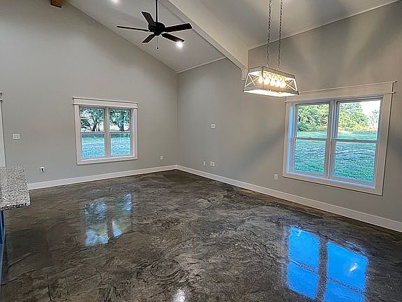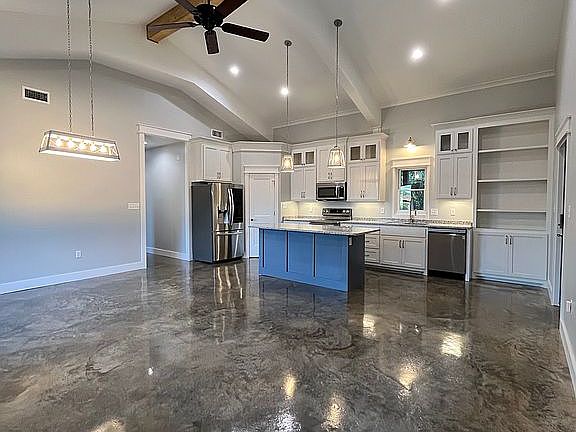 - Vaulted ceilings and an open floor plan for the kitchen, dining, and living areas.