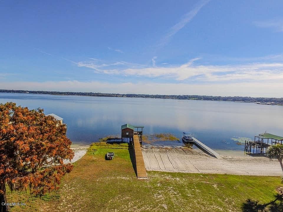 Your Lakefront retreat awaits... Turn Key with 100 ft of white sandy beach and expansive views of Lake Weir. This charming bungalow is ideal for relaxing weekend getaways. Renovated throughout with LVT flooring and SS appliances. Beautiful Lake decor appointed with everything you need. Enjoy the sunrise on the wrap around screened lanai overlooking sprawling Oaks and shimmering views. A spacious paver patio offers great space for entertaining, BBQ's, and an evening fire. Complete with a dock, lift, and boathouse.