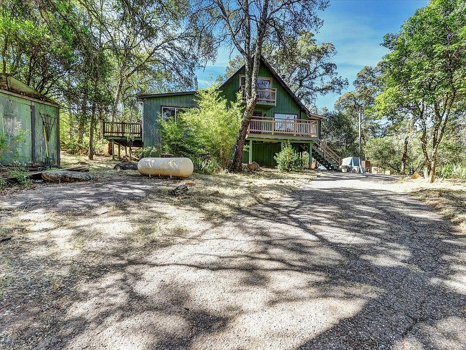 Contractors & Investors, a great opportunity here! Located in the bucolic Indian Springs area sits this sweet 2.5 acre property with a 4 Bedroom, 2 Bath Home, including a 935 SqFt Detached insulated music STUDIO w/Power, Year-round POND & NID canal. This home needs fixing and is sold AS-IS. It is designed with 2 Bedrooms & 1 Full Bath on each level, & laundry on the main level. The primary bedroom has a balcony and walk-in closet. The spacious sunny kitchen allows for large gatherings. Get cozy with the wood burning stove in the living rm. The land is studded with magnificent rock out-croppings, oaks, pines, almond & lilac trees, fenced garden, and pasture. Walk the trail behind the house to find another level of this usable land. BRING YOUR HORSES. Wired for full-generator. Multiple out buildings for storage. This property has so much POTENTIAL! This is the sweetest fixer-upper.