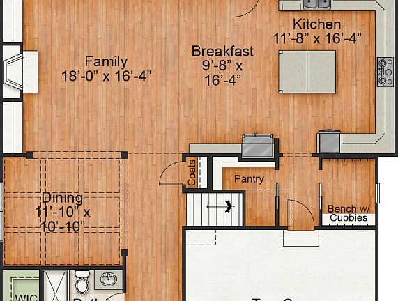 The Kittrell is a classic 2-story home with first floor guest suite thats perfect for entertaining and everyday living! The first floor includes an open family room, breakfast nook and kitchen. In the kitchen youll find stainless steel appliances, granite countertops, a tile back-splash, convenient island, and a walk-in pantry. The first floor also has a study/extra bedroom, formal dining room, and full bath. There is a family foyer with access from the 2-car garage, and a mudroom with a bench and cubbies. The owner's suite is located on the second floor and includes a walk-in shower and dual vanities, as well as a large walk-in closet. Upstairs youll also find two additional bedrooms, a rec room, a loft space with a built-in desk and cubbies, and the laundry room. There is unfinished space on the third floor. The Kittrell also has hardwood floors, a fireplace, and a covered front porch.