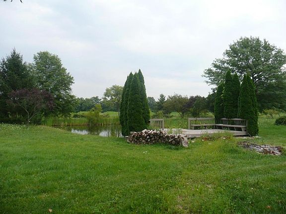 Custom built home situated on 5+ acres with a stocked pond, barn, and multiple fruit trees! Featuring a dramatic two story great room with wall of windows, floor to ceiling double-sided stone fireplace, and NEW bamboo flooring throughout! Formal dining room/optional den with French Doors and custom built in shelving/cabinets! The fully equipped kitchen offers granite counters, stainless steel microwave/dishwasher, tile flooring/backsplash, a built-in desk area, and large eat in area next to the fireplace! Also featuring a vaulted 1st floor owners suite, 1st floor laundry with utility sink, 3-season/sun porch, extra large 2 car garage, full poured basement ready to finish with Bilco door to outside and pellet stove for economical heating option. New radon system 2014. New Roof 2015.