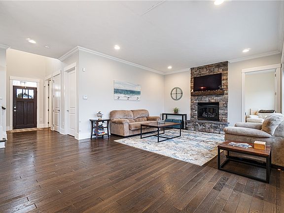 Beautiful newer build in the coveted community of Newbury. Wide open floor plan with kitchen open to the family room, also has outdoor access...perfect for entertaining. Neutral colors and upscale materials allow for many options of decor. The main floor also offers a bedroom/flex room feature perfect for family or guests, designated home office, powder room and convenient mud room right off the garage. Upper level is host to 4 spacious bedrooms and second floor laundry. The owner's suite is spacious w/ spa-like bathroom, his/her expansive walk-in closets. The lower level is finished with a full bath, exercise room, great room with media section and custom bar adding a min of 1000-1200 sq. ft. to the living space plus additional storage. The yard is flat and perfect for outdoor activities and just steps away from the park!