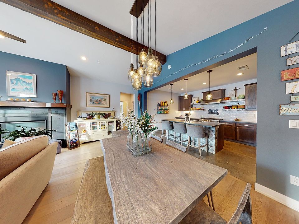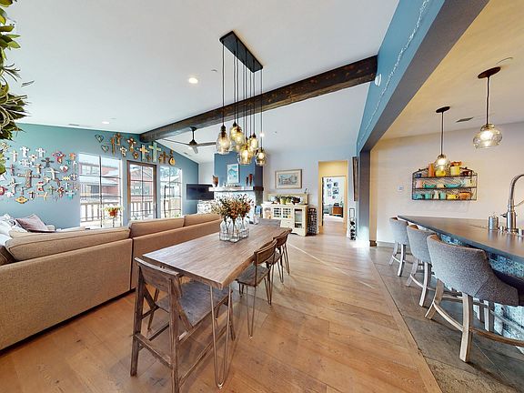 Located in Snowcreek Resort's newest phase, CreekHouse, and backing to the creek and meadow, this south facing, three bedroom, 2.5 bathrooms, plus an extra powder room on the lower level, has a two-car garage and is approximately 2145 sq. ft. The property features many custom upgrades, such as, wood plank flooring in the living area, stairway and hallways, heated floors with custom tile and stone in the entry, kitchen and bathrooms, custom metal work on the stair risers and on the living room fireplace, and a smart home thermostat. The upstairs powder room features an industrial style pedestal copper sink, electric fireplaces in the primary and guest bedrooms, the primary bedroom & bathroom features a barn door for the spacious walk-in closet, ceiling fan, and custom stonework behind the large soaking tub, with views of Mammoth Rock and Snowcreek meadow and creek. The living room has large picture windows with views towards the Sherwins, and custom designer lighting in the dining room and kitchen. The gourmet kitchen features a stainless farmhouse style sink, stainless steel appliances and pullout shelving in the cabinets. The large storage closet in the entry has been made into an office space, but easily converted back to a storage area. Extra insulation was added in the common area walls and there is a hose bib in the garage for convenience. Enjoy the sunny large balcony with views in all directions located off of the living area. Sold partially furnished. Close to Snowcreek Athletic club and town’s trail and shuttle systems.