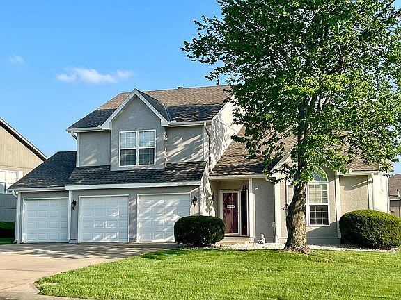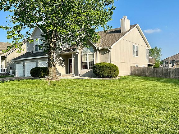 RARE FORMER MODEL HOME—Beautiful, OVERSIZED cal-split with vaulted ceilings on large FENCED corner lot in STONEGATE, just a block from the school and pool. Large formal dining-room overlooks spacious living-room w/clean-burning gas log fireplace. Bright, vaulted-ceiling kitchen boasts long eat-up counter, large breakfast nook, sunroom windows, a door to the back deck and nearly new MATCHING SS French-door refrigerator, dishwasher, microwave and oven with convection for “air-frying!” Private master-suite on upper level has spa-like bath with jetted tub, dual sinks and separate shower. Two bedrooms and laundry conveniently on main level. Fourth bedroom and 3/4 bath located in the finished daylight, walk-out basement with additional storage and second large living space. Extra-large 3-car garage perfect for cars & hobbies with storage closet and utility sink. Amenities include treed, paved walking trails, huge zero-entry pool with whirlpool and bathrooms. The BIG TICKET expenses are done! NEW 2021: Furnace, AC & Exterior Paint. New 30 yr Composite Roof—Timberline HDZ-GAF Lifetime Wty (2020) and newer Interior Paint. Wired for Google Fiber and ready for you in Stonegate of the Good Ranch. Call or text Austin 816-875-0222.
