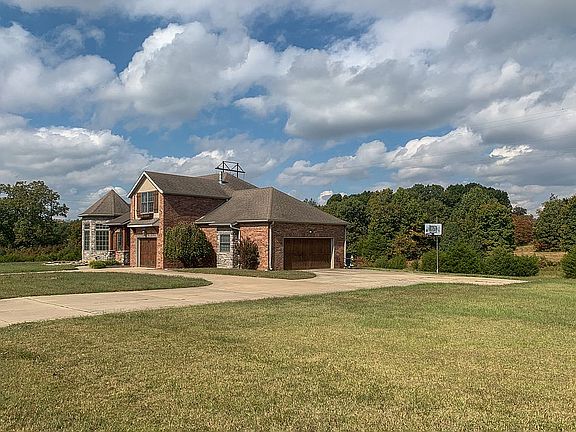 SALE PENDING. For inquiries, Call or Text Owner Travis at 417-403-5881. FSBO, willing to pay buyer agent fee. Beautifully custom built, all brick home on private dead end road on the middle of a 5 acre lot, just minutes from Hwy 160 and Springfield! Walk into this spacious, remodeled home with up to 17 ft ceilings, split-level open floor plan, featuring large vaulted 10 ft windows in living room with amazing view of wooded scenery and endless sunsets! Home has updated neutral paint, hardwood and tile floors throughout (master is laminate), 3 bedrooms with bonus room, and 4 full bathrooms with showers. Master bedroom suite upstairs with dual sided fire place, additional storage closet with laundry chute, private bathroom featuring separate his & hers vanities, jetted tub, walk-in shower and separate office nook. Finished walkout basement with wet bar and additional bedroom. Additional separate 900 sq ft unfinished below grade basement, makes a great storm shelter with a lot of storage space. New Trane HVAC Smart System with two units, including one separate unit for Master Bedroom suite upstairs, installed 1.5 year ago. Includes stainless steel kitchen appliances and three fire places (one in main living room, one in basement living room and one in master suite). Open sunset view with a deck that overlooks a small water retention area that fills with rainwater runoff, then slowly drains. Three car oversized garage with large circle driveway on paved private cul-de-sac road with only three homes on the road. 3811 sq ft finished and 900 unfinished.