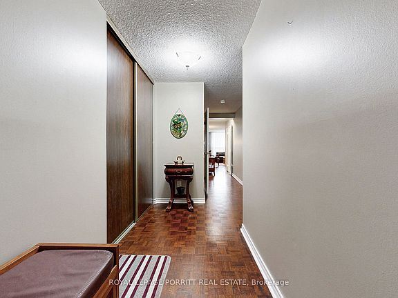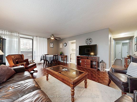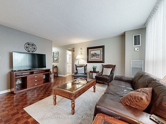 Bright and Spacious South-Facing Unit! Enjoy sun-filled living in this beautifully maintained condo featuring generous principal rooms with classic parquet flooring throughout. The renovated kitchen is perfect for cooking and entertaining. This unit offers two full bathrooms and the convenience of ensuite laundry with extra storage. Step out and relax on two separate balconies, offering great outdoor space. Whether you're a first-time buyer or looking to downsize for retirement, this home is ideal. Prime Location Walk to the creek, Lake Ontario, parks, scenic trails, transit, and GO station. Close to major highways, downtown Toronto, Pearson Airport, and shopping amenities.