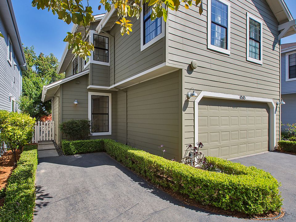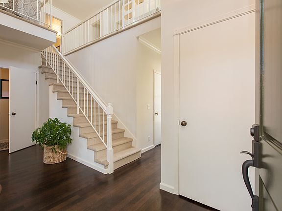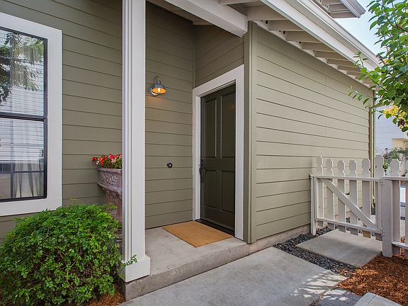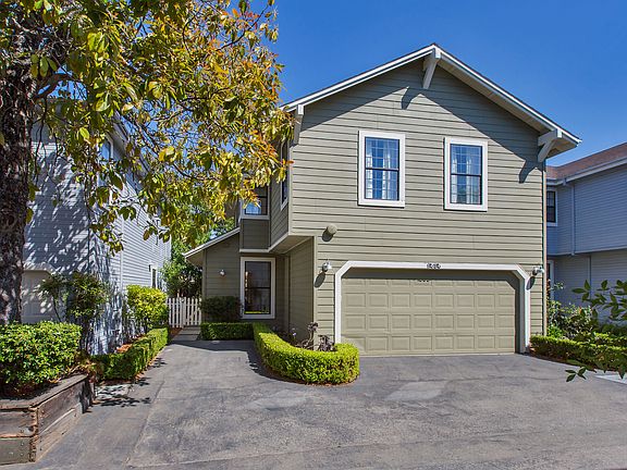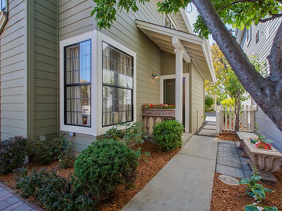 Built in 1990, this contemporary home is tucked into a private cul-de-sac in central Alameda. The exterior design of the home consists of wood siding, gabled eaves, divided light dual-paned windows, a large brick patio, and a lovely white picket fence that surrounds the house and garden. Mature plantings and trees fill the generous outdoor space with luscious foliage that also adds to the privacy of the space. The front door and porch are located on the side of the house protected by a high, gabled eave. The paneled wood door opens to a foyer with a stunning, contemporary pendant light fixture that illuminates the two story high ceilings. The main level has newly refinished engineered hardwood floors, many large windows for plenty of natural light, and elegant crown moulding throughout. The open floor plan includes a living room/dining room combination, a modern, updated kitchen, half bath, dedicated laundry space with top-of-the line LG appliances and built-in cupboards, and a coat closet. The spacious living room/dining room features a gas fireplace that has a simple white crown moulding mantel with a raised marble hearth and marble surround. A pair of windows to the left of the fireplace offer a view of the garden, and elegant French doors with sidelights open to the patio and garden from the dining room, perfect for indoor-outdoor entertaining. The inviting kitchen is next to the dining room area and has a granite backsplash and counters, a sleek, modern faucet over the stainless steel sink, a Whirlpool Gold Satin stainless steel French door refrigerator, and a built-in Whirlpool microwave. The cupboards offer plenty of kitchen storage, and a large window over the sink brings light and a view of the garden’s blooming jasmine into the room. An open, contemporary stairway leads to the upper level and is complimented by a striking pendant globe light fixture and large, divided light windows. The exposed upper level office area has custom, built-in home office furniture and cupboards that take creative and utilitarian advantage of this space. The large master bedroom has tall windows, neutral carpeting, a generous closet, and traditional crown moulding. The en suite master bath includes a dual-sink wood vanity, Corian counter, a shower over tub combination, new sconces, crown moulding, and a large window for plenty of ventilation and natural light. The roomy second and third bedrooms are adjacent to each other and face the cul-de-sac. Each of these light and bright bedrooms is carpeted and has a closet with sliding doors and shelves. The garden is a special feature of this home and is accessed from the front door or via the French doors in the dining room. The beautiful rear and side gardens are surrounded by a sweet white picket fence, and contain extensive brick and paved patios for entertaining. The lush landscaping includes fruit trees, boxwood hedges, jasmine, bougainvillea, and several Japanese maple trees. The yard is large enough to please a gardener or anyone who simply enjoys outdoor space.