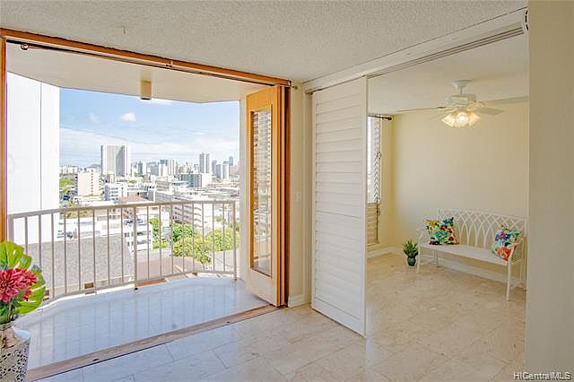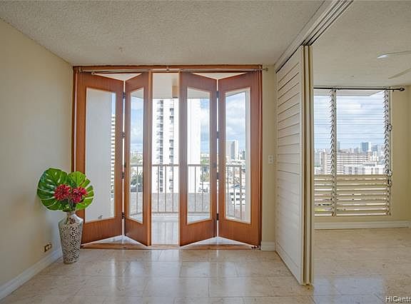 Wake up to a beautiful sunrise, enjoy a cup of tea on your open lanai. This unit???s special feature??? French doors??? give you full access to your entire lanai. There is an enlarged closet in the main bedroom, use the 2nd room as an office or yoga room. Marble floors throughout, fresh paint, extra shelves, washer/dryer in the unit, and 1 parking stall! Amenities include a small gym, Jacuzzi, swimming pool, bbq area, hair salon and convenience store. Close to the freeway and easy access to downtown. Come see it today!