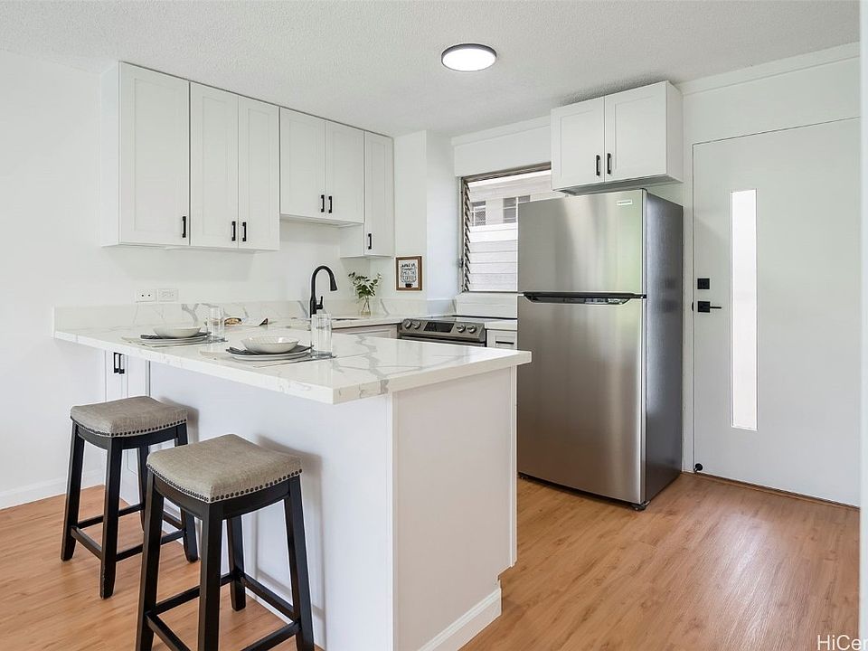 Discover urban elegance in the heart of Honolulu. Nestled in Punahou Wilder, this 2 bed, 1 bath condo marries modern living with central convenience. Undergoing a meticulous transformation in 2023, this unit's sleek design is highlighted by its open spaces featuring luxury vinyl wood floors juxtaposed against tasteful black accents. The chef-inspired kitchen boasts calcatta quartz counters, new appliances and white shaker cabinets, leading to a spacious peninsula island - a culinary enthusiast's dream. Continuing the modern motif, the bathroom exudes opulence with a contemporary shower and a cascading waterfall head. Step out to your sizable covered lanai for the lush backdrop of the Manoa mountains and experience the comfort of cool valley breezes in this well-ventilated haven. Finally, enjoy the building's amenities, secure access, and prime location as you're situated moments away from the freeway and popular points of interest in Honolulu. Don't delay and miss your chance at this coveted gem!