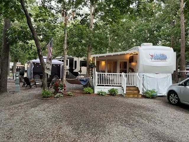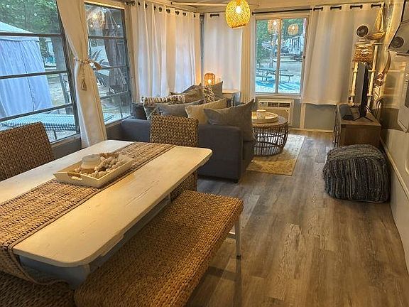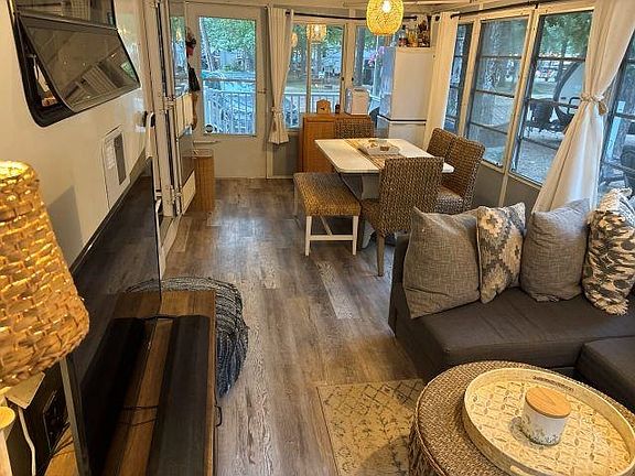 Fantastic 2006 5th wheel with an attached Durabilt sunroom for added living space. Enjoy the sounds of nature on your front porch or sit comfortably in your 13x10 new decked screened gazebo wired for lights, TV and comfort! Parking for 2 cars with the extra overflow parking in view for when your family and guest visit. Fire pit with chairs, hammock and plenty of outdoor space makes this a prime lot. Back into the unit and you enter into the sunroom with an additional sleeper sectional, dining table, ice maker, extra refrigerator and freezer and electric fireplace/storage cabinet for those cooler spring and fall evenings. Up into the main area you will find an abundancy of storage, nicely appointed kitchen area with a brand new Graystone 3 burner oven/stove combination and SS microwave. Decent size fridge and freezer combo. Another dining area that converts to a bed and a Queen futon like sofa for even more sleeping space. Venture into the large bunk area with a Queen mattress on the bottom with a twin bed on top and half bath and ample storage. Take a couple steps up to the primary with new walk-in shower and separate toilet area. King size bed with even more storage under it and a full mirrored wall closet and more built ins. This unit has a combo washer/dryer that is being sold as is. Sea Pines is a wonderful seasonal lot rent community minutes to all the fantastic beaches SJ has to offer. Park is well maintained with a new playground and newly renovated bathhouse, both right across the street from the unit which is perfect for overflow of guests and the kids. This unit is fully stocked and ready for you to enjoy the season, even the golf cart and BBQ is included! This unit also has a view of the lake, which is only a 30 second walk away. Sea Pines has many planned activities for young and old alike. They have a swimming lake, pool, playground, recreation center, and a general store. Membership to Thousand Trails is required.