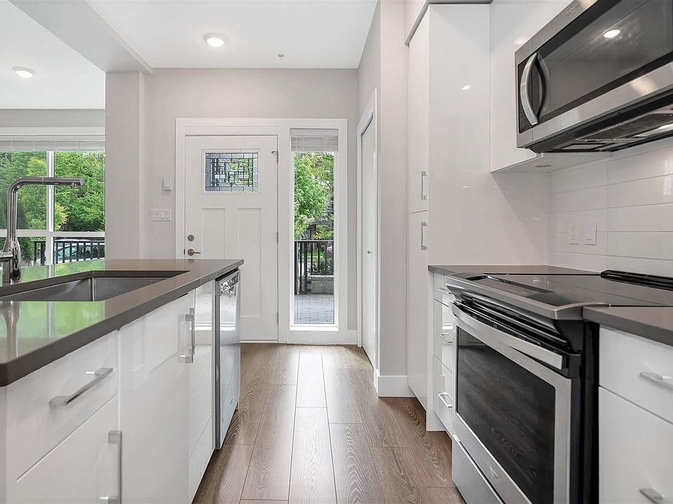 This 2 level city home feels like a spacious home but come with a worry-free lock and go lifestyle. Entertain inside the roomy open concept floorplan and elegant kitchen or cook up a storm on the BBQ in the fully fenced patio and yard. Upstairs features 2 large bedrooms both big enough for a king-sized bed, spa-like ensuite with tub/shower combo plus XL vanity and main bathroom with a soaker tub. BONUS: 3 parking stalls, 5 storage lockers plus in-suite storage. Best location in the building: no neighbor on one side, firewall on the other and concrete toppers between each level make this unit whisper quiet. Walking distance to Guildford mall, Guildford Rec Centre, restaurants, amenities. Balance of 2-5-10 warranty. Pictures taken before tenants moved in.