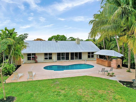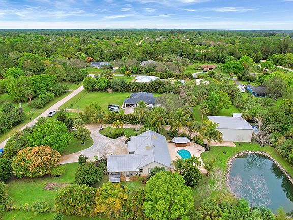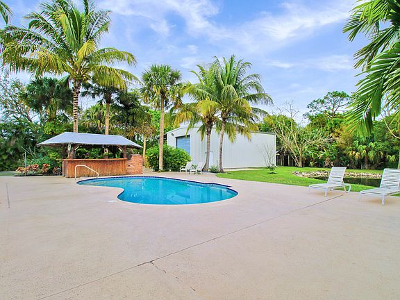 Discover a unique gem in the serene equestrian community of Jupiter Farms with this exceptional 1.25-acre estate. Perfectly marrying country living's tranquility with modern conveniences, this property is a rare find. It stands as a testament to the beauty of outdoor living and the potential for a self-sufficient lifestyle.At the heart of the estate is a spacious workshop, providing ample room for a variety of activities, from crafting to storage, and even secure boat parking. To the right of the house, you'll find a thoughtfully positioned garden shed and raised bed garden, inviting you to cultivate a variety of vegetables and herbs for a rewarding farm-to-table experience. The estate's allure is enhanced by a pond stocked with fish, surrounded by an extensive variety of fruit trees, ensuring a lush, green vista and a steady supply of fresh produce. This blend of agricultural and aquatic elements creates a harmonious natural environment. Central to enjoying the Florida lifestyle is the estate's private pool, which reaches a depth of 8 feet, offering a refreshing escape during warm days. Adjacent to this is a covered outside kitchen featuring a brick pizza oven, perfect for hosting gatherings and enjoying alfresco dining. This outdoor living space promises endless entertainment and relaxation opportunities. The residence itself, designed with resilience in mind, features 3 bedrooms and 2 bathrooms and includes hurricane-proofing to ensure safety throughout the seasons. Each room within the home is thoughtfully designed to foster a connection with the estate's stunning natural surroundings, providing comfort and warmth. This distinctive property is more than just a home; it's a lifestyle choice offering privacy, sustainability, and endless possibilities for outdoor activities and gatherings. Whether you're a gardening aficionado, an avid fisherman, or someone who cherishes tranquility and nature, this estate promises a life of fulfillment and cherished moments in Jupiter, Florida.
