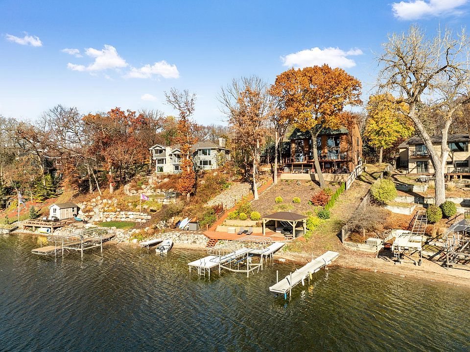 This stunning lakefront retreat on Lower Prior Lake is the ultimate entertainer's dream. Situated on over 1/3 acre of prime lakefront property, the home offers 75 feet of sandy beach frontage and captivating views of the water and sunsets. The property features a spacious, walk-out 2-story layout with 3 bedrooms, 5 bathrooms, and a host of high-end finishes. In 2010, the home was expanded with a second-story and master suite addition, blending rustic elegance with modern luxury throughout. The main level includes a spacious master suite with sweeping lake views, a luxurious en-suite bath, and the convenience of main-floor laundry. The heart of the home is the grand great room, which boasts soaring 22.5-foot vaulted ceilings and a floor-to-ceiling custom stone fireplace. The open layout is perfect for entertaining, with an updated gourmet kitchen featuring custom cabinets with soft-close drawers, quartz countertops, a commercial-grade 36" gas range, an exhaust hood, and a massive center island ideal for hosting friends and family. Upstairs, the loft area opens to two additional bedrooms, one with an en-suite bath, and another full bath, offering plenty of space for guests or family members. The lower level walkout leads to a private patio, providing easy access to the beach and offering fantastic views of Prior Lake. With a half-round concrete driveway and a two-car garage, there’s plenty of parking for visitors.