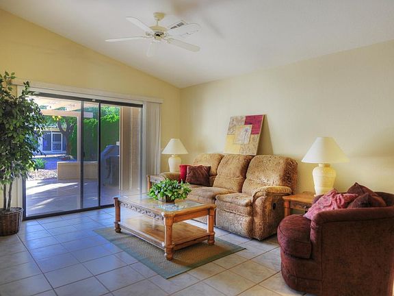Prepare to be impressed with recent upgrades to this 2-master suite home! Interiors recently repainted in warm neutral tones; newly re-faced cherry kitchen cabinets w/ extensive pull out shelving, rich granite counters, undermount sink, island with eating space, breakfast room with built in buffet. Both bathrooms have refinished cabinets, upgraded lighting; walk in closets in both bdrms have efficient built in cabinets/racks. Separate shower & jacuzzi tub in master bath. Tile and wood laminate flooring throughout; garage has been completely repainted also w/ built in cabinets & heavy duty overhead storage racks; soft water loop & R/O system; plumbed for laundry sink. Beautiful backyard with southern exposure, extended patio with ramada, BBQ has gas hookup. Refrigerator, washer, gas dryer & BBQ included for your convenience. Beautiful & highly durable 'Sierra Stone' coating on driveway and front walkway.Enjoy a blend of carefree living with elegance and affordability. Super home value located in a world-class resort environment! Pebble Creek is an age restricted community.