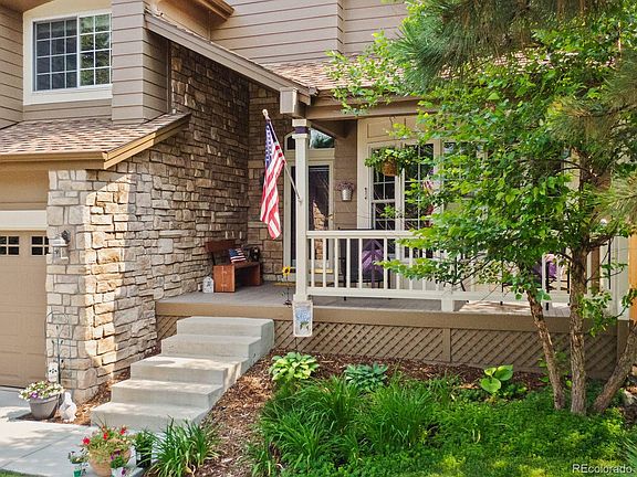 Pristine updated family home in desirable Stonegate in tip-top condition from big-ticket improvements. Stellar curb appeal features covered front porch that provides a shady summer escape. Gleaming hardwoods greet you at foyer, and extend throughout main & upper levels. Formal living room is bright & airy, with vaulted ceiling & bay window. Living opens to formal dining, with upgraded chandelier. Sunny kitchen features solid surface Corian countertops & updated subway tile backsplash, tile floor, and island with pendant duo that overlooks back deck & greenery. Convenient pass-through to dining rm saves steps. Double glass doors open to back deck that spans the width of the house. Beautiful yard design features privacy & shade from mature trees, w/ rm for kids, pets, gardens & relaxing under the stars. Kitchen sightline to family room allows for easy kid supervision. Family rm features soaring vaulted ceiling with fan, gas fireplace w remote & blower, beneath mantel-to-ceiling custom plank surround. Extra convenience in built-ins & 2nd patio access. Master suite sits under A-frame vault w/ ceiling fan. Sleek, elegant totally remodeled master bath features spacious walk-in shower, double vanity, custom tile backsplash, granite countertops, private WC & walk-in closet. Secondary bedrms feature ceiling fans & blinds, and are serviced by full bath with solid surface counter & updated tile walls. Tile mosaic on stair risers adds a touch of understated elegance. Valuable updates include new windows on main level (2013), new roof (2013), wood floors throughout (2013), new insulated garage door & belt drive opener (2019) & new driveway (2019) new furnace (2021) new fence (2020). Finished basement features large great rm, new carpet, & ample storage. Community amenities include pool, tennis, clubhouse & welcoming neighbors. Walk to elementary & high school, pool, tennis, playground. Around the block from open space trails. Minutes to highway, light rail, malls, Tech Center.