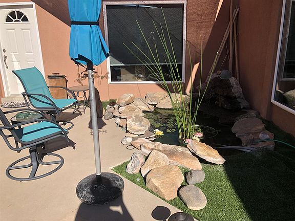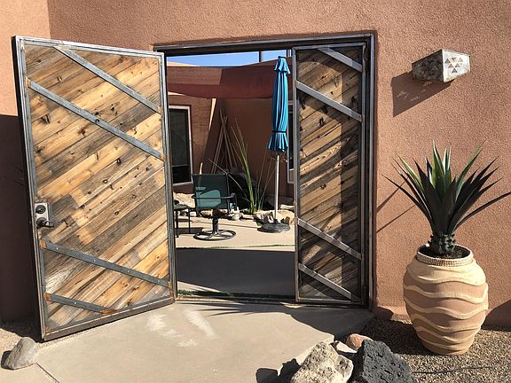 Perfectly set on corner lot, this beauty feels like home minute you pull up. SW style home has warm & inviting living room with 6ft picture windows overlooking mesa & interior atrium, complete with sounds of Koi Pond. Den has wood-burning fireplace & bread oven for homemade pizza. Spacious kitchen with granite countertops looks to backyard & views of the Sandia Mts. Relax with morning coffee on covered patio, or evening in front of natural gas fire pit. Master bedroom is large with no lack of storage, including walk-in closet. Updated vanity with granite counters, beautiful tile & glass shower remodel makes this entire room an owner's retreat. Property is unique with detached 32'X28' workshop,220outlets. Along side of shop are 5 storage bays, 3 covered( 1tall for RV) & 2 open.
