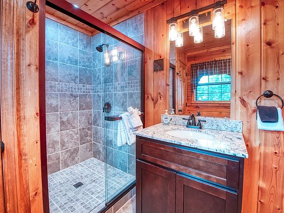 Located in Hidden Springs Resort, Black Bear Retreat is close to everything, yet feels away from it all! The resort is only 1.5 miles from Dollywood and Splash Country. Black Bear Retreat is the perfect location for your Smoky Mountain Getaway. This fully furnished cozy 2 bedroom cabin includes 1 King Bed, 1 Queen Bed, and 2 queen sleeper sofas. Upon entering the cabin, the living room, kitchen and dining room await you with an open floor plan. The King bedroom and bathroom with new large walk in tiled shower are also on this floor, as well as a large wraparound deck. The sofa in the living room is a Queen Sleeper Sofa. Downstairs is a spacious gameroom that includes a big screen TV, Pool table, Foosball, and Multi-cade (loaded with tons of 1 or 2 player video games). Off of the gameroom are the Queen Bedroom, Bathroom, and laundry closet with stackable washer and dryer. Off of the gameroom is also another deck that includes the hot tub. The sofa in the downstairs gameroom is also a Queen Sleeper Sofa. New Hot Water Heater 2019, Cabin Stained in 2020, All New Kitchen Appliances 2020, New washer and dryer 2021, New Hot Tub 2021.