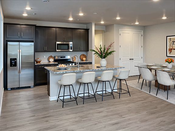 The kitchen on the first floor comes with Whirlpool stainless-steel appliances, and designer finishes throughout. Enjoy dark brown cabinets with roll-out shelves, white quartz and granite countertops, and warm brown vinyl plank flooring. This home also features a north-facing covered front porch, a 2-bay alley garage, and updated technology like a Ring doorbell and smart thermostat.