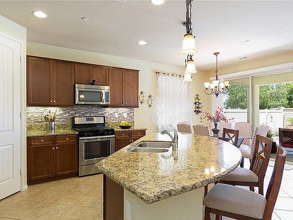 One of a kind!! Welcome home to the 55+ Solera Diamond Valley Community by Del Webb. This home boasts an entertainer's dream backyard with built-in barbeque with rotisserie, sink and refrigerator. If that doesn't get your heart swooning complete the dream with a full fireplace and spa. For ideal outside living this one has it all. This home's curb appeal features a custom-built walk path and steps, concrete borders, well-manicured and maintained lawn, plants, water feature, and easy maintenance border and side yard. Plenty of upgrades including the leaded glass front door, 9' ceilings, motorized blinds in the family room and primary bedroom and a water softener/reverse osmosis. This highly sought after "Serenity" model features two bedrooms, two full baths, and a den/office. All living areas except bedrooms and den are diagonal laid tile, that is neutral in color and compliments neutral and compatible colors of the home. This home features an open concept floorplan. The kitchen is open to the family room with large center island and a breakfast area, upgraded stainless steel appliances, granite counter tops and full contrasting backsplash, under cabinet lighting, upgraded lighting fixtures, upgraded cabinetry and a spacious pantry. This home includes two panel upgraded doors, separate laundry room and extra storage, and is an open and spacious floorplan. Primary Bedroom has ensuite bathroom that includes separate tub and walk in shower, upgraded cabinetry and countertops. Second bath has a tub/shower combination. The garage features a four foot extension great for the boat or truck. The fabulous Solera Clubhouse features a full gym, 1 indoor and 2 outdoor pools, library, craft and card rooms, billiards room, pickleball, bocce, tennis courts and so much more! Schedule a private showing today.