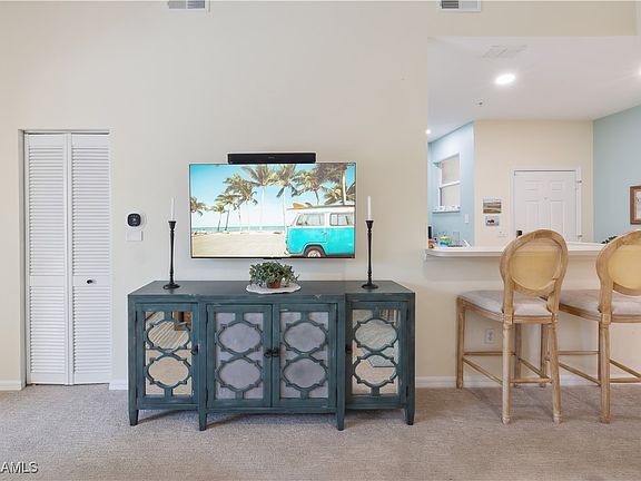 Popular Beachwalk community is in the heart of where you want to be yet this is a small community with a hometown feel. This second floor home shows pride of ownership throughout. Updated kitchen is fresh with off-white cabinets, undermount lighting, High end LG SS appliances including LG Washer/dryer tower (right off kitchen) new 2023, open concept kitchen has a breakfast bar. Living room has vaulted ceiling and overlooks the trees lined view from your lanai. This home has a new AC in 2021, new carpet & fully interior paining in 2023, water heater 2023. New window treatments - blinds and blackout curtains in 2 of the bedrooms. New ceiling fans in bedrooms, dining and living area and lanai. Grout has been professionally cleaned and sealed. New storm door with retractable screen/glass. The community has no damage from the last two major storms, new roofs throughout in 2021. You will be walking distance to Target, Publix, CVS, Walgreens, Planet Fitness, banks, restaurants. Fort Myers Beach is 5 miles away, 10 miles to Sanibel and 15 miles to RSW Airport.