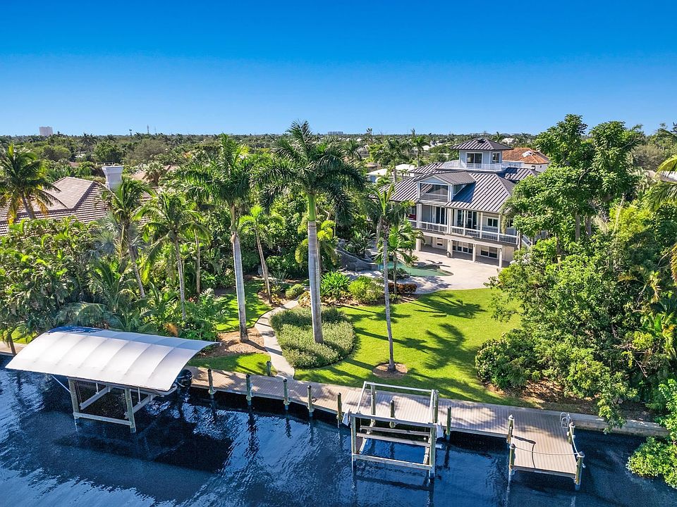 Discover your own piece of paradise in this exceptional waterfront residence, a masterpiece of concrete construction extending up to the first floor. Tucked away on a quiet street, this home is only a stone's throw from the river, providing convenient access to deep-water boating from your backyard waterfront oasis. This three-story custom marvel boasts impact doors and windows, a recently installed standing-seam metal roof, an elevator for added convenience, and an expansive 3-car garage. The master retreat occupies the entire third floor, featuring a den, an expansive walk-in closet, and a private deck. Situated on a private .66 acre homesite, complete with a pool featuring an impressive rock slide, beautiful cascading waterfalls, and lush tropical landscaping. Enjoy the quick boating access from your back yard featuring two boat lifts rated at 16,000 lb and 8,000 lb. The designer kitchen showcases exquisite custom cabinetry, top-of-the-line appliances, an island, and a built-in dining area. The guest rooms, each generously sized and ensuite, boast voluminous ceilings and ample walk-in closets. The ground level of this home is a haven for entertainment and fun.