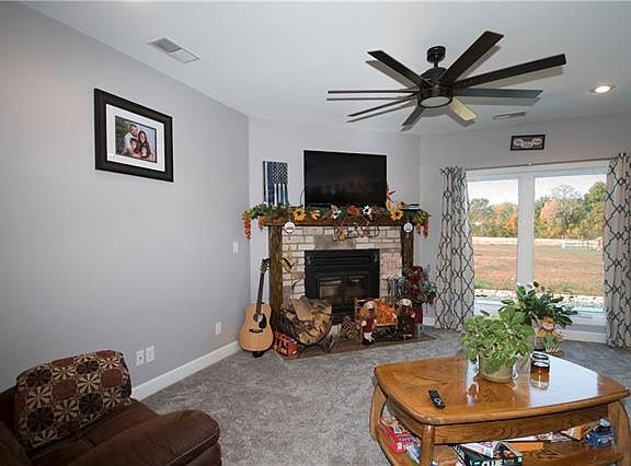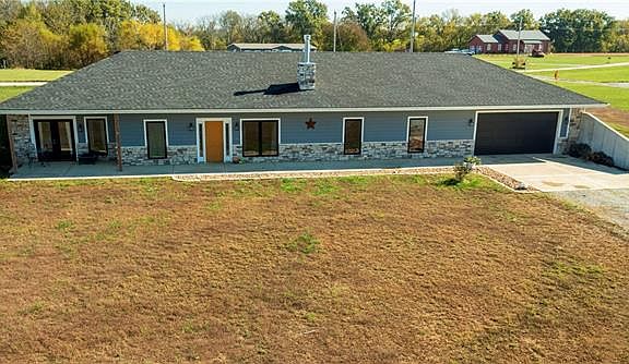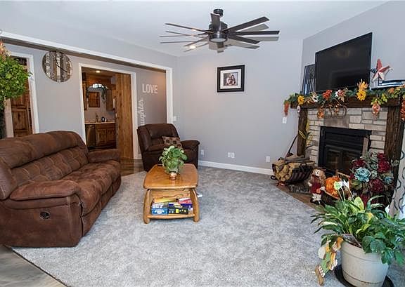 LOCATION, LOCATION, LOCATION!!! This one checks all the boxes if you are looking for a home close to town, but still with acreage to call your own! Sitting on 5 acres just an hour from Kansas City off of I-49, this home features 2,578 square feet with 4 bedrooms and 2 full baths. When you enter the home you will be wowed by the marbled epoxy flooring, large kitchen with custom cabinets, and a dining area with tons of storage and space. The living room, which has a wood burning fireplace, is open to the entryway and dining room. The master bedroom has an attached bath with a shower head you will have to see to believe, a walk-in closet, and doors leading outside to the front covered porch from the bedroom. The media room/office area and the third bedroom is on the same side of the home as the master bedroom. The additional two bedrooms, 2nd bathroom and laundry room are on the south side of the home. Although the home is large enough by itself, you might find yourself outside more than inside, enjoying the acreage. And if that wasn't enough, the size of the oversized attached garage and the detached 2 bay garage with work area (+/- 1,150 sf feet) will top it all off! You can't ask for much more in a property than you will find here so ACT QUICK!
