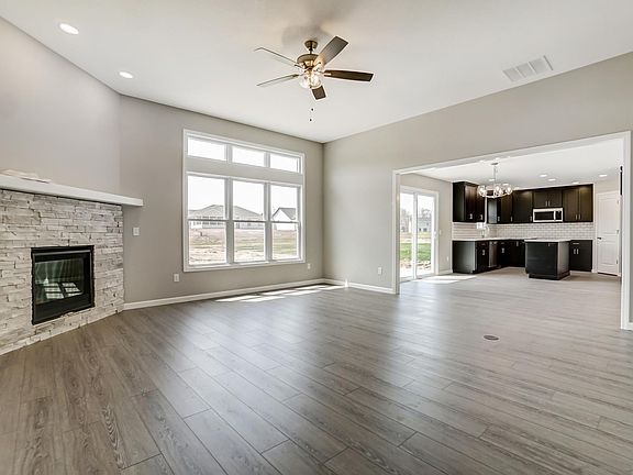 Carriage Place Homes presents the Cariole in the popular neighborhood Grand Pointe at Copper Creek. The exterior features a cultured stone front and front porch pillars w/ stacked stone bottoms. This OPEN floor plan has a master suite on the main floor with a large 2 story closet and double sink vanity. The kitchen features custom maple cabinets, quartz counter-tops, large island, glass tile back-splash and a nice pantry. Three large bedrooms w/ a full bathroom and large linen closet can be found upstairs. This home also features a nice sized laundry room, tons of storage space throughout, trendy colors w/ white trim plus an energy efficient HVAC system.