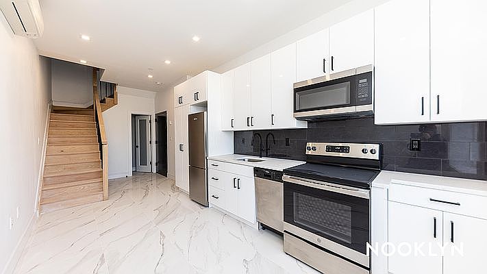 Brand New 2 bed 1.5 bath duplex(wood staircase) with in unit washer and dryer, brand new appliances including a built-in microwave, dishwasher, spacious closets, balcony, and plenty of natural light. Close to A/C trains. Central A/C High Ceilings Video Intercom Natural Light in Living Area Washer dryer installed Outdoor Space Skyline view Roof access Eat In Kitchen Stainless Steel Appliances Dishwasher Built in microwave Stone countertops