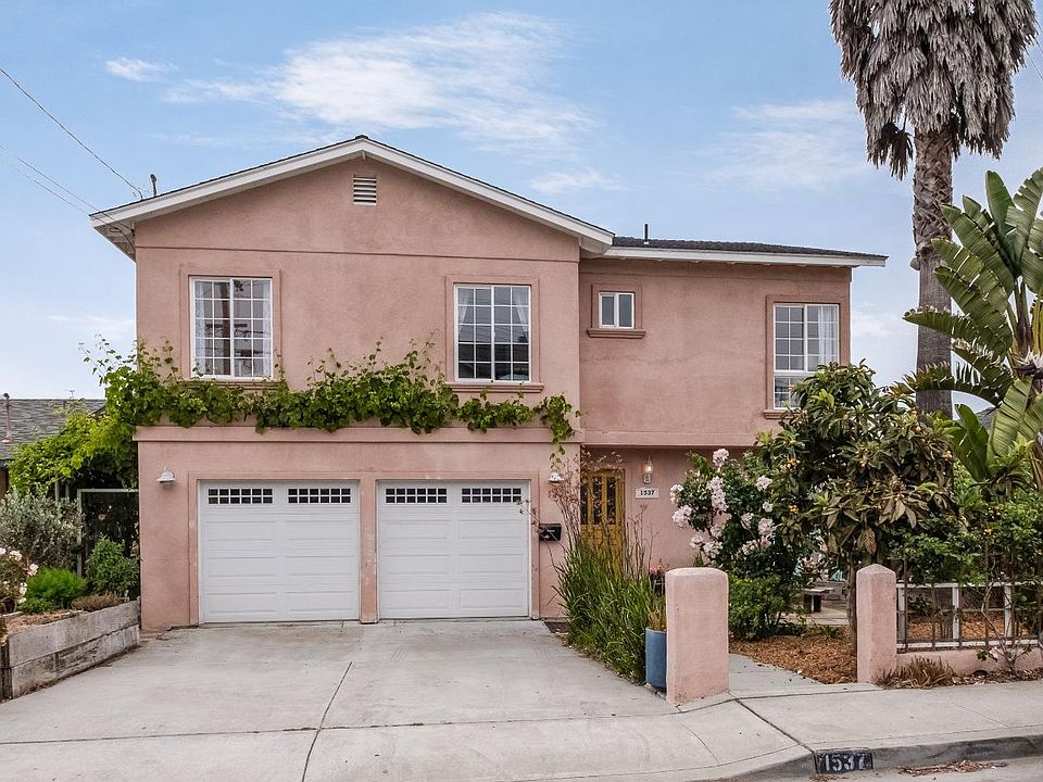Large Seaside home with views of the bay and city lights with a versatile floor plan perfect for single or multi-generation households. Master suite on ground floor. Two additional bedrooms and a full bath upstairs plus a family room with two more bedrooms and full bath also upstairs. Upper level accessible via its own entry if desired. Mature edible garden with grape vines, avocado tree, loquat, lime, lemon, orange, pear, apple, and more. Move-in ready but can be upgraded to build equity.