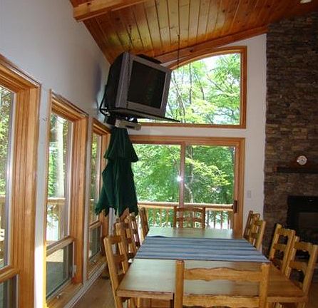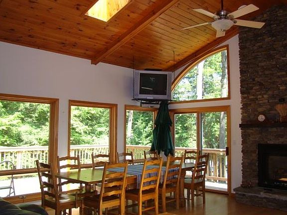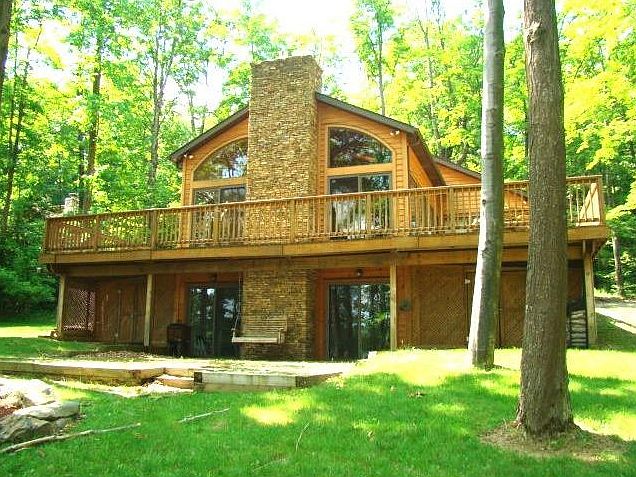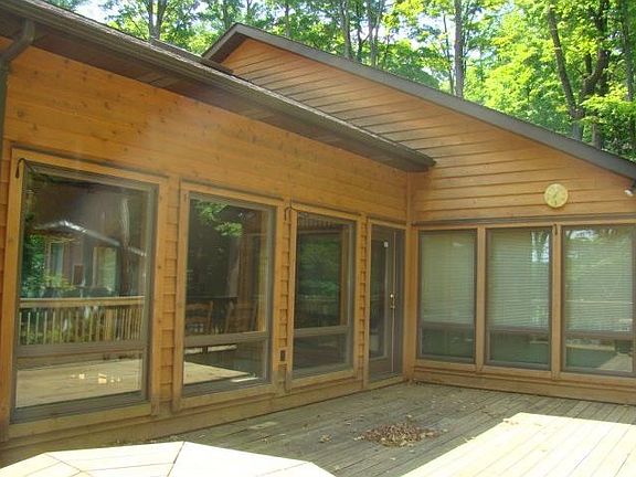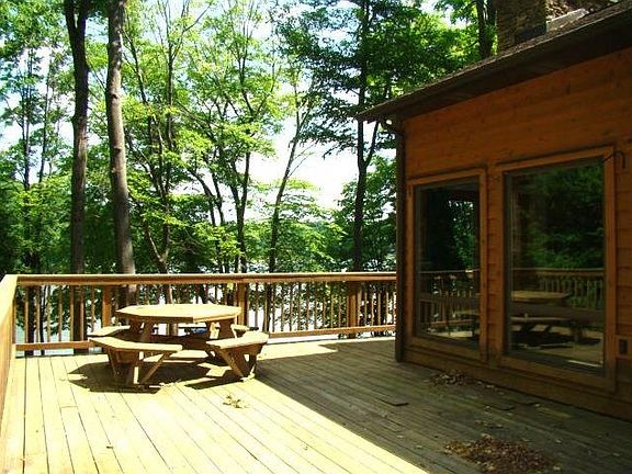 Beautifiul lakefront home with 100' waterfrontage; warm wood cathedral ceilings, sky lights, walls of glass with awesome views, 2 stone fireplaces. Low maintenance synthetic wood floors throughout; spacious kitchen breakfast island, custom cabinets, terrific family room with fireplace opens to lakeside patio. Liquid radiant heat in floors. Wrap decking at the house. Fantastic waterfront area includes boat docks, deck with seating and wonderful views. This is the ideal "lake home" with a great floor plan