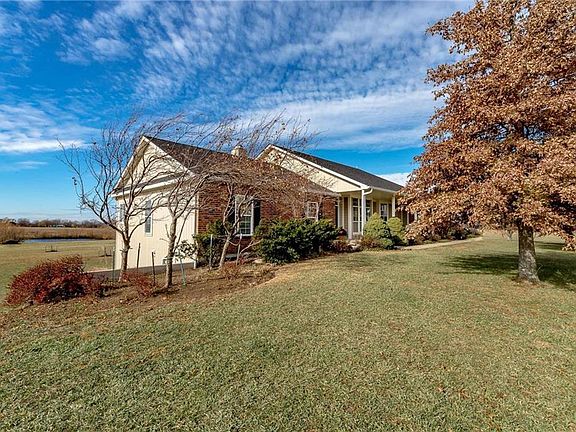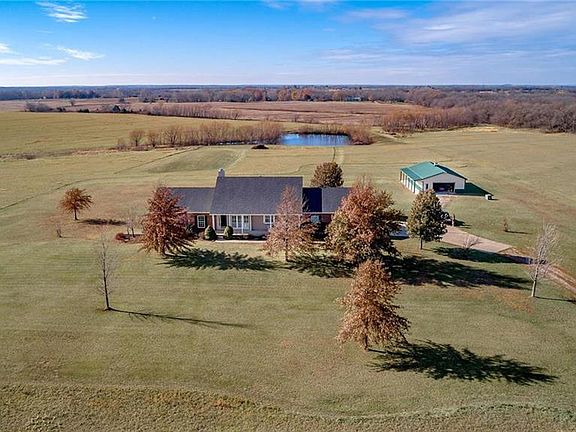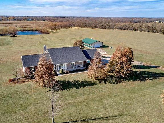 This beautiful RANCH sits on 9.78 acres & has it all! Main level Master w/2 walk in closets & jetted tub. Lg kitchen w/hardwood floors, pantry. Main level Laundry, all appliances stay! 10' CEILINGS in FINISHED Walkout basement too! Lg bedrooms & closets, tornado shelter, shop area. Finished Rec Rm w/wet bar. Patio view of 1 acre fully stocked pond & 30x50 Barn w/concrete flrs, windows, ins walls, 9' OH Door & electric. 5 acres Brome hay. NEW roof, gutters & exterior paint. Central vac, Heat pump & added insulation!