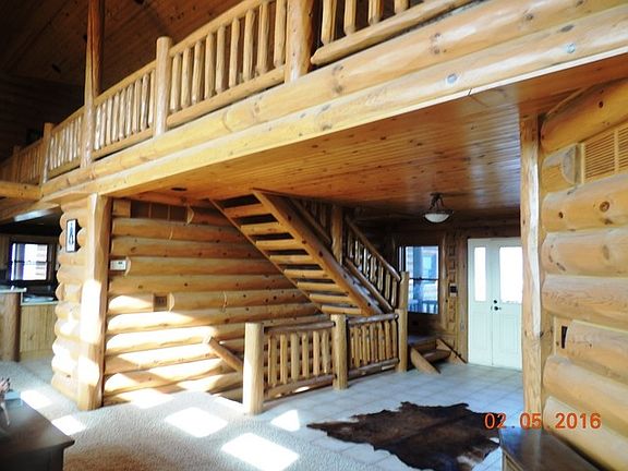 True log home w/10" logs. Stunning great room with stone fireplace towering up to 18'' cathedral ceilings. Kitchen has ceramic tile flooring, sub zero appliances,custom Hickory cabinets, corian countertops, large main floor laundry room , 1100 sr ft loft is a bedroom /guest suite w/ full bath, main floor french doors to the Master bedroom suite complete with his & hers closets , double doors to deck ( hot tub ready ) , bath with jetted tub, sep shower with 2 shower heads, granite double sink vanity, lower level 9'' ceilings, a rec room, gorgeous log framed doors , numerous double doors to patio area under deck plus large windows in both of the bedrooms , there is also an area for a second kitchen or another bedroom. The home has 18 x 15 three seasons porch plus 80'' long log deck with amazing views to the south. Buildings consist of a 71 x 36 heated 9 stall horse barn with attached indoor riding arena, lighted outdoor & pasture . There is also a 60 x 80 storage building w/concrete floor .
