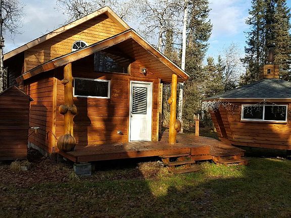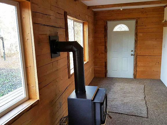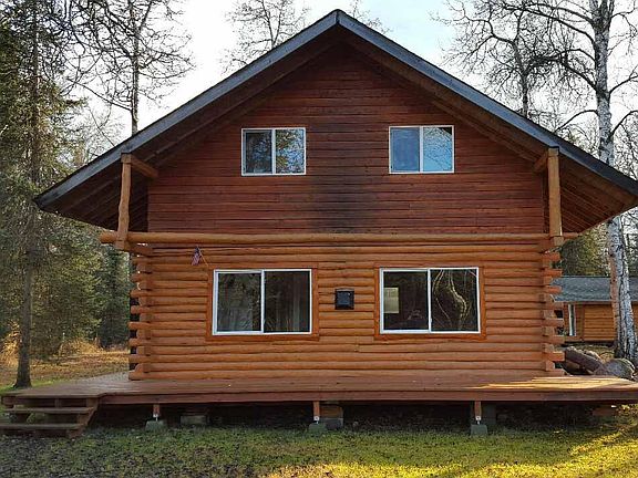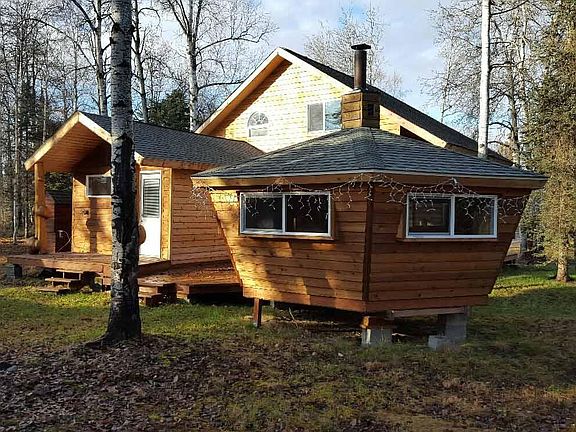 Three sided log cabin with 2x6 wood framed second floor. 12'' pine plank wood floor in kitchen. brand new carpet through out . Two large bedrooms upstairs with tong and groove ceilings. Unique ''firehouse'' right off back entrance to cabin is a great place to entertain guests along with private sauna. Large drive thru out building holds four snow machines with room upstairs.