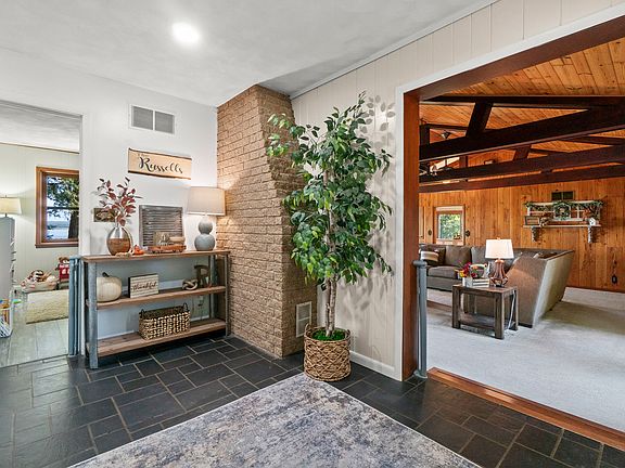 Discover the serene beauty & unmatched privacy of this sprawling ranch home, nestled among lush woodlands with over 200' of exclusive river beachfront. Perfect for nature aficionados, the tranquility of the river is your daily backdrop. This updated home offers 3 spacious bedrooms, including a luxurious primary suite. The suite features a custom-built headboard & bed frame, a generous walk-in closet & an adjoining bathroom remodeled in 2020 to be your private retreat. Both bathrooms have received stylish updates, ensuring modern comfort. The kitchen has been beautifully updated & leads into a remodeled dining room adorned with large windows that frame the stunning outdoor views. Large living room with cathedral ceiling, skylight & gas log fireplace. The finished lower level includes a family room & a guest bedroom, providing additional space for relaxation. Outdoors, the covered back porch transitions into a covered patio, an ideal spot for lounging or alfresco dining while enjoying the sound of the nearby river. Additionally, the property boasts both an attached & a detached 2-stall garage, offering ample space for vehicles & storage. Recent upgrades include new windows 2017 & well in 2018, furnace & central air system in '13 & shingles on the house in '08, making this home as practical as it is charming. Embrace a life of peacefulness & privacy in a home that promises a retreat from the hustle & bustle of daily life. Make your lifestyle dreams a reality in this riverfront gem!