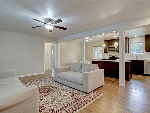 Welcome to this stunning ranch-style home in the heart of Longmont with a finished basement and oversized detached two-car garage.Step inside to gleaming hardwood floors on the main level and a wide-open design ideal for entertaining. Modern paint scheme, hardwood floors, and a completely remodeled kitchen bring this property to life. Gorgeous dark, custom cabinetry, quartz countertops, kitchen island, stainless steel appliances, deep farm style stainless sink with window to backyard, slow-close luxury drawers, and gas range that overlooks the dining room and the family room. Escape to the north wing of the home featuring two large bedrooms split by a completely updated full bathroom with tiled floors and double vanity. Convenient laundry room/mud room right off the kitchen complete with side-load washer and dryer. Extra wall to ceiling cabinetry in the mud room with pantry shelves.