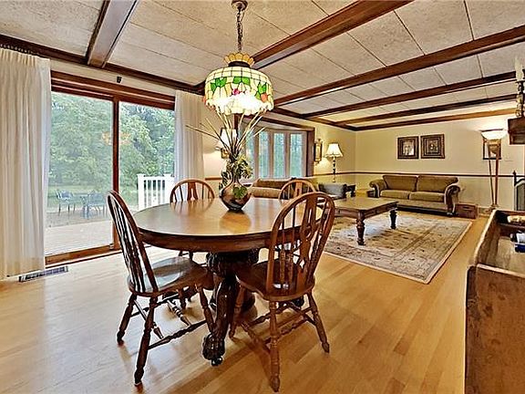 Fabulous ranch home with a one acre setting in the heart of Franklin Park and seconds from Old Orchard Park! Entry with ceramic tile flooring and cherry beamed ceiling. Open living and dining rooms with hardwood flooring, cherry beamed ceiling, brick fireplace with wood mantle, updated bow window and access to rear patio. Eat-in kitchen boasts quartz counter tops, updated stainless appliances including double convection ovens, and abundant counter and cabinet space. Adjacent family room opens to fenced portion of yard and 25x15 screened porch. Master bedroom with hardwood flooring and private full bath with updated vanity. Two additional bedrooms with hardwood served by hall bath with updated vanity. Wooden spiral staircase to expansive lower level offering large game room with fireplace, two additional rooms (bedrooms or den), updated full bath, and large laundry/storage/utility room. Enjoy outdoors with two patios and screened porch overlooking fabulous yard. Roof '19.