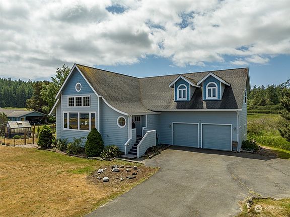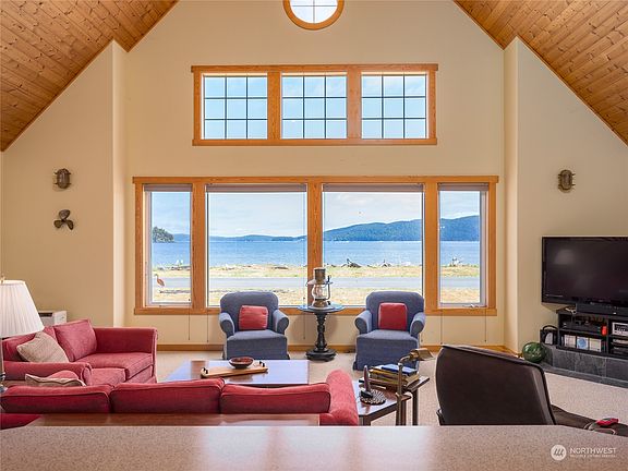 CUSTOM-CONTEMPORARY BEACHFRONT HOME. 4 bedrooms/3 bathroom 2007 architecturally designed home on Swifts Bay. Only 8 mins. to the ferry and 5 minutes to the marina. The beach offers clamming, raising oysters, crabbing, and a fire pit for s'mores. A fenced garden w/drip system, fruit trees, a greenhouse, and a shed. Underneath the house offers enormous storage space. The additional parcel of 4.1 acres (TaxID# 251242010000) is included. The 2nd floor has stunning views. The great room and the open kitchen face the bay and are bathed in natural sunlight. Large windows highlight the views of various boats including the San Juan ferries. High vaulted knotty pine ceilings, a custom-designed suspended loft, and a slate fireplace. Stunning home!